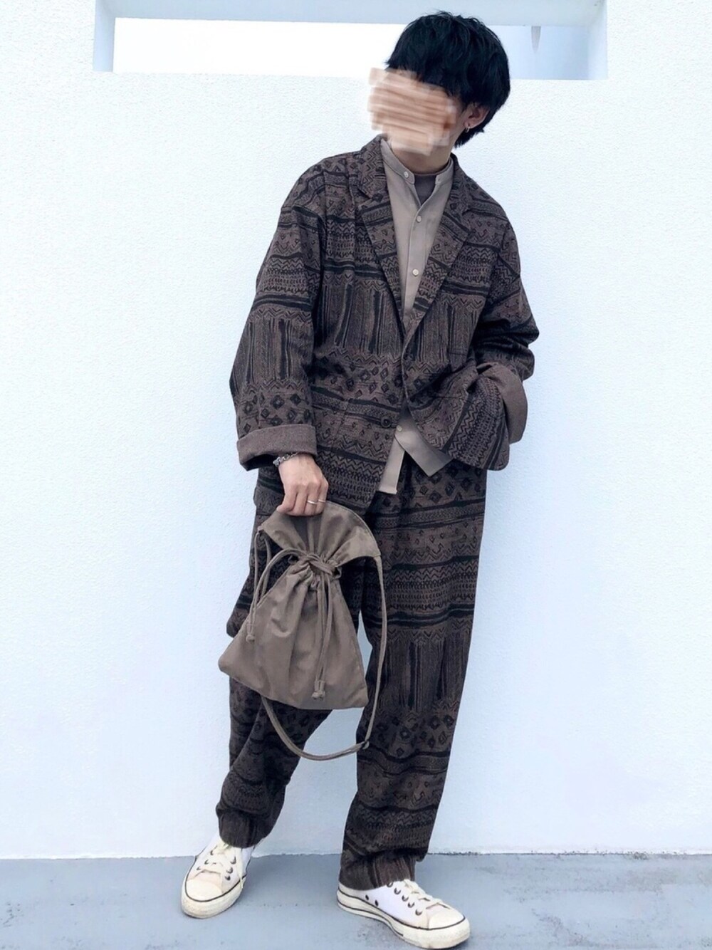 セットアップコーデ 一目惚れしたセットアップを 中心に組んだコーディネート 独特な雰囲気のバティック柄と、 ブラウンのようで パープルのような 絶妙な色合い、 オーバーサイズの ルーズなシルエットが 特徴のセットアップ ベージュや白などの アースカラーのアイテムを 合わせて全体をまとめています 個人的には バンドカラーシャツの ボタンを空けて モックネックのカットソーを レイヤードさせたり、 ロールアップさせた袖口から 少しだけ見えるブレスレットが 今回のポイントです