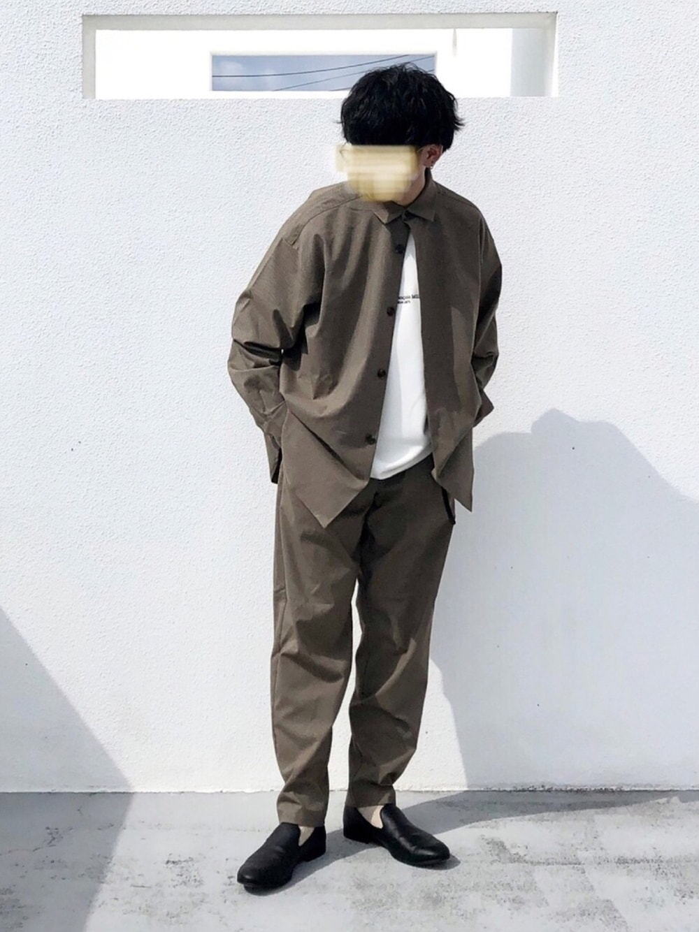 秋コーデ インナー、セットアップ、ベルト 全てSENSE OF PLACEで 組んでみました SENSE OF PLACEは 上品なアイテムが多いイメージで、 今回のセットアップも 少し厚手のハリ感のある生地が 高見えするので気に入ってます 全体的にオーバーサイズですが パンツの 裾にかけて綺麗なテーパードが 掛かっていることで、 ユルくなり過ぎず まとまったシルエットになっています よく見ると 細かいガンクラブチェックが 入っているのも 秋らしいポイント シャツのボタンを ひとつだけ留めると インナーが見えたりするので 着こなしに変化が欲しいときには 多用します
