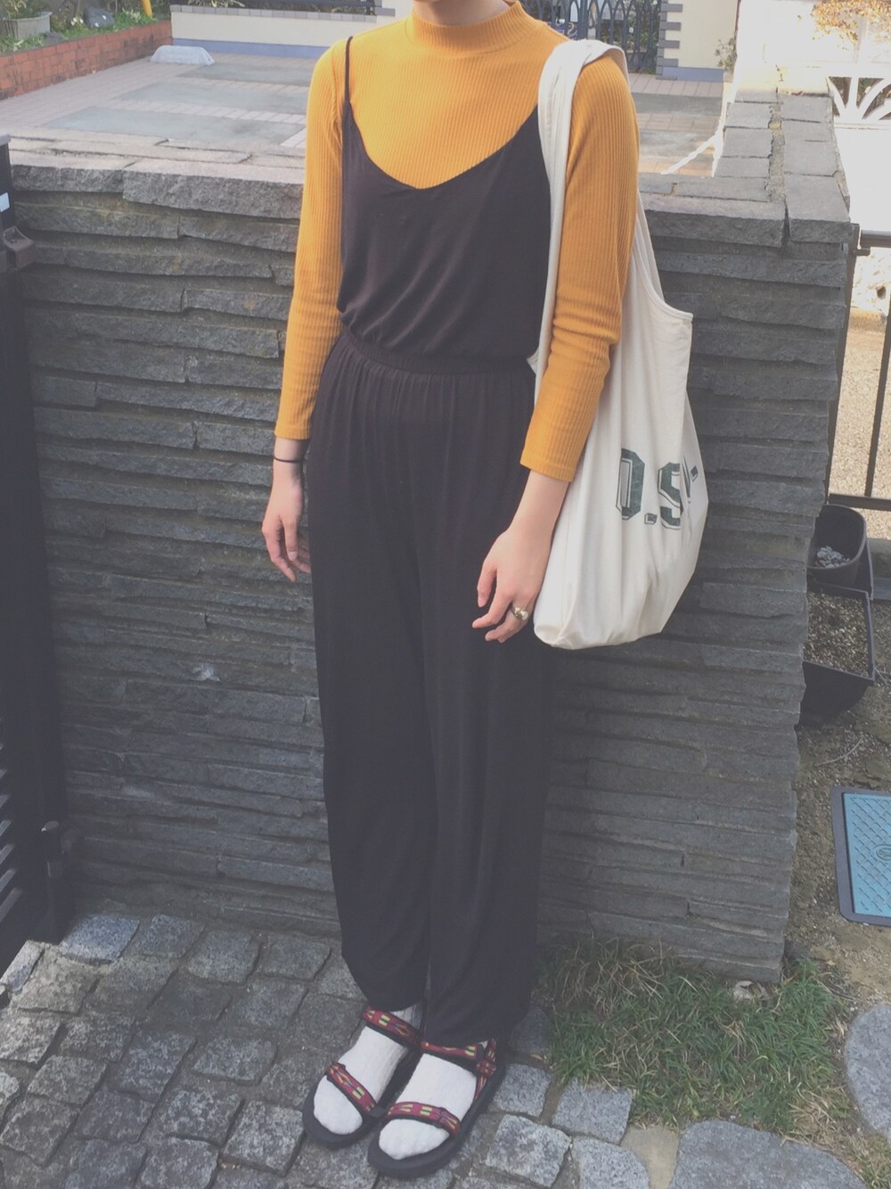 0314. 春っぽい温度でぬくぬく🌼☺️ たくさん歩いたから疲れちゃった!! カラシ色は個人的に好きなんだけど、春イメージがあるんだよねぇ😊春は差し色が映える!、!