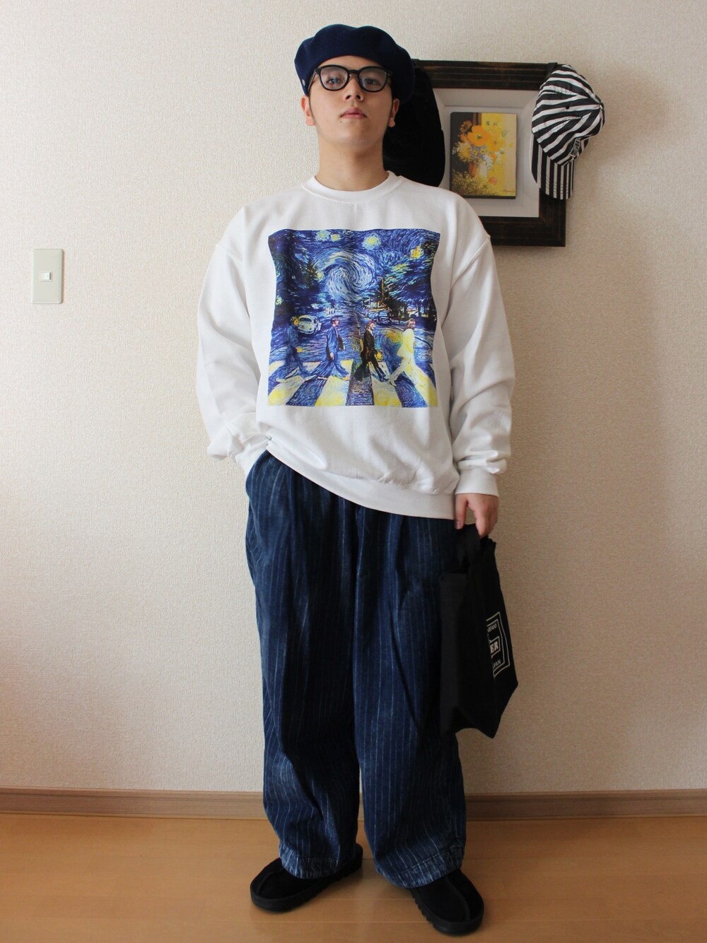 前回に引き続き、今回もThe Beatlesのスウェットを着たスタイルです! デニムパンツ、ベレー、メガネと、 徹底的にブルーで固めて主張を抑えました! PORTER CLASSICのデニムパンツと、 PORTERのトートバッグをリンクさせたのもポイント!(笑)
