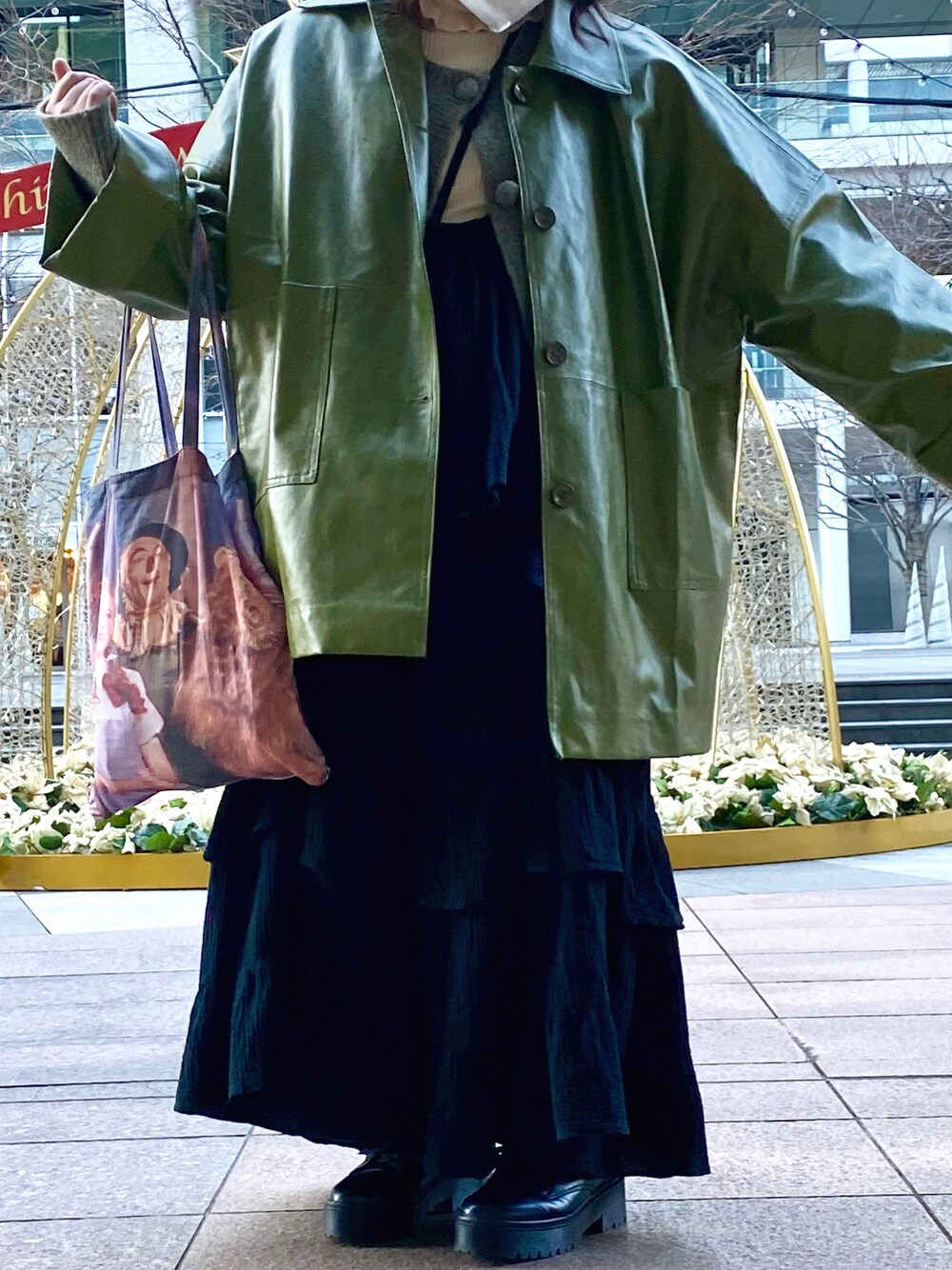 寒くてもレザージャケットが着たい! そんな願いを叶えたコーディネート🤲🏻 オーバーサイズのレザージャケットに 厚手のニットを重ねました シンプルなスタイルにアクセントとして インパクトのあるトートバッグを
