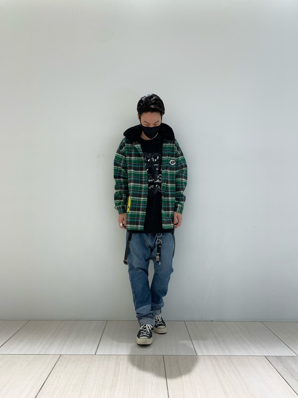 akihiro_okada(ROYAL FLASH なんばパークス店)のその他アウター「STUD MUFFIN/スタッドマフィン/ヘビーネルチェック/ボア サガラ刺繍 フーデッドシャツ」を使ったコーディネート