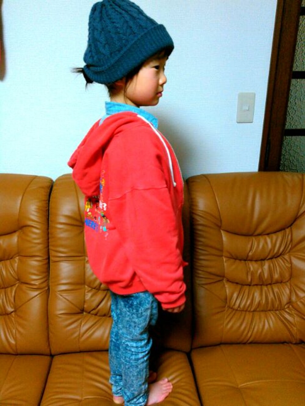 赤いスウェットは、後ろはウォーリーの絵です。ヴィンテージ大好きなので、ついつい購入してしまいます(T_T) ケミカルパンツは、娘のお気に入り★ しかーし、ソファの上に立つ。。お行儀悪し(>_<)