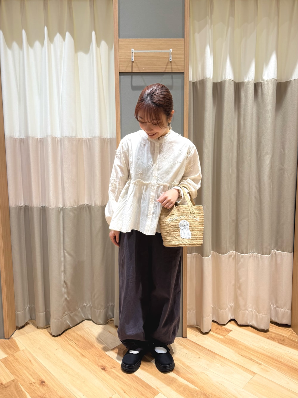 お花の3D刺しゅうがかわいいブラウス🌼 立体感のあるデザインとギャザー切替のふんわりシルエットが女性らしいアイテム👧🏻 綿100%素材で着心地も抜群です🙌🏻 ボトムスはタックギャザーパンツ🩳 ゆとりのあるシルエットで楽に着用可能で、体型カバーにもなってくれます🧚♂️ *身長150cm Mサイズ着用