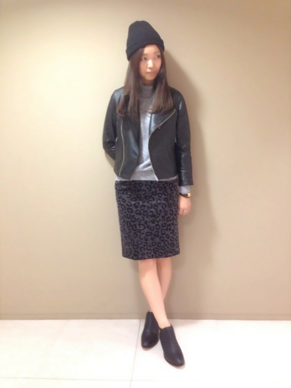 素材感のやわらかいレオパードスカートです。 ライダースにサイドゴアで今年らしいコーディネートです!!