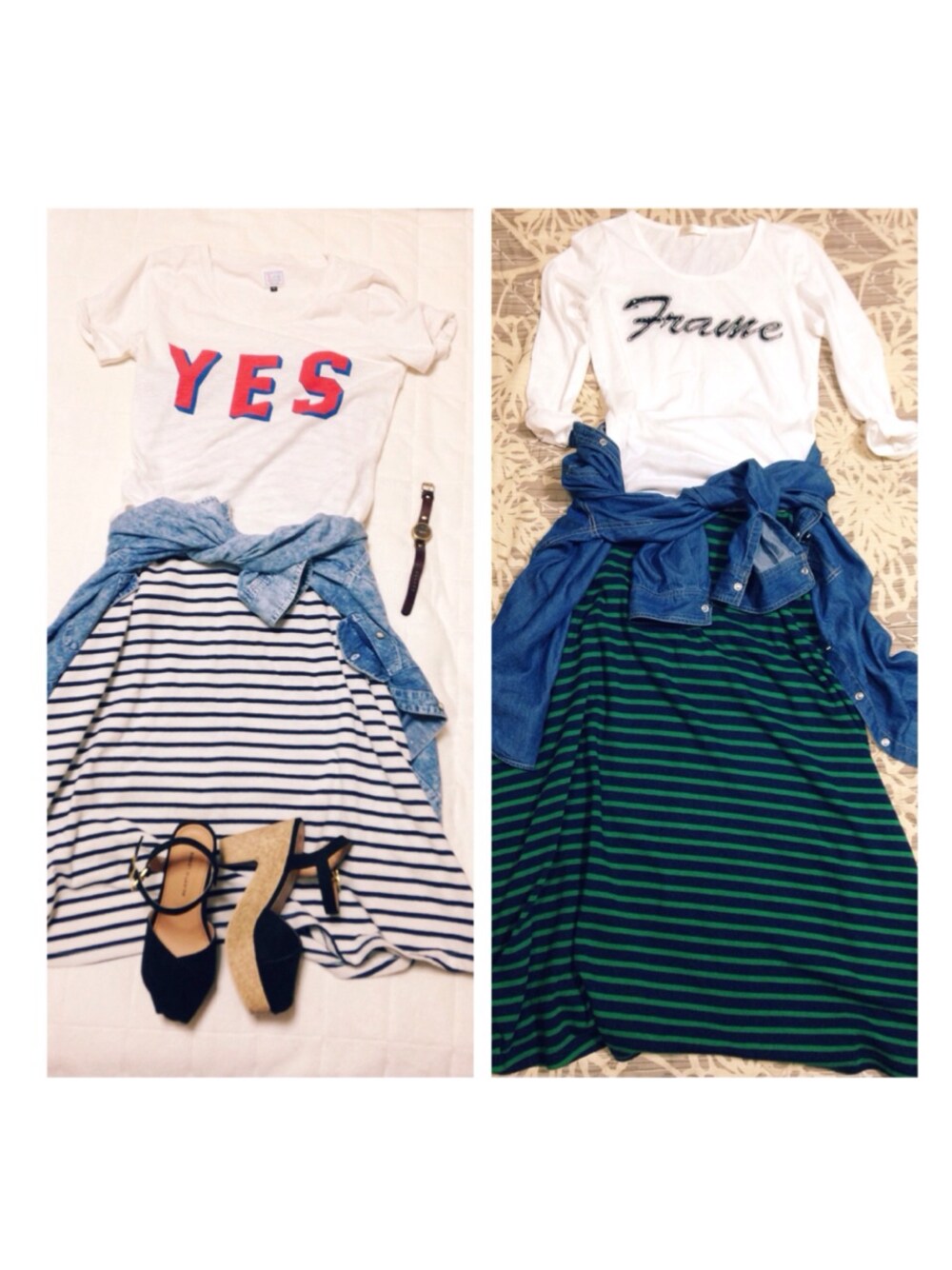 親子で。 母と色違いで買った マキシスカート 私はミドル丈にして サンダルで。 シャツは 母にもらったもの。 スカート▷vert dence シャツ▷不明 母 スカート▷同じ シャツ▷LEPSIM LOWRYS FARM Tシャツ▷不明 ボーダー好き親子です。 見ていただき ありがとうございます!