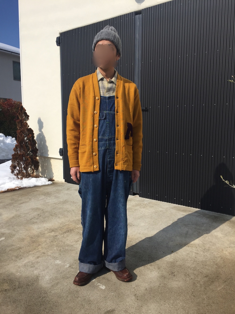 50〜60s TOWNCRAFT BOX型シャツ 50〜60s vintage カーディガン マスタード M 40s ヘラクレス オーバーオール ハンマータグ 50s レッドウイング 青タグ このカーディガン、虫食いだらけで程度最悪ですがサイズ、色、レタードMと自分好みなので大好きな一着。 今日は雪も溶けて暖かいので春コーデです。