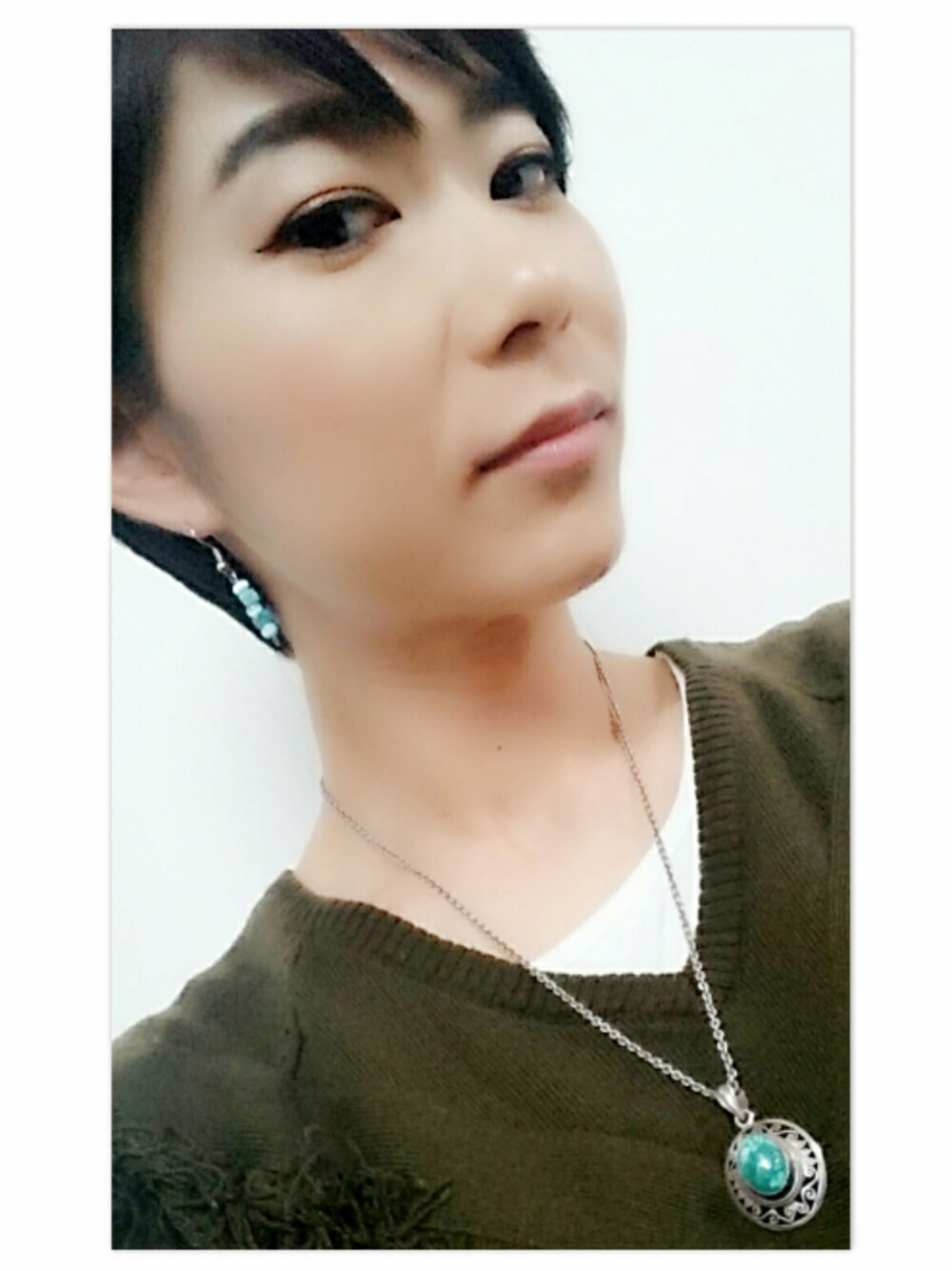 ブルー系のネックレスを着用したレディースの冬コーディネートの1枚目の写真