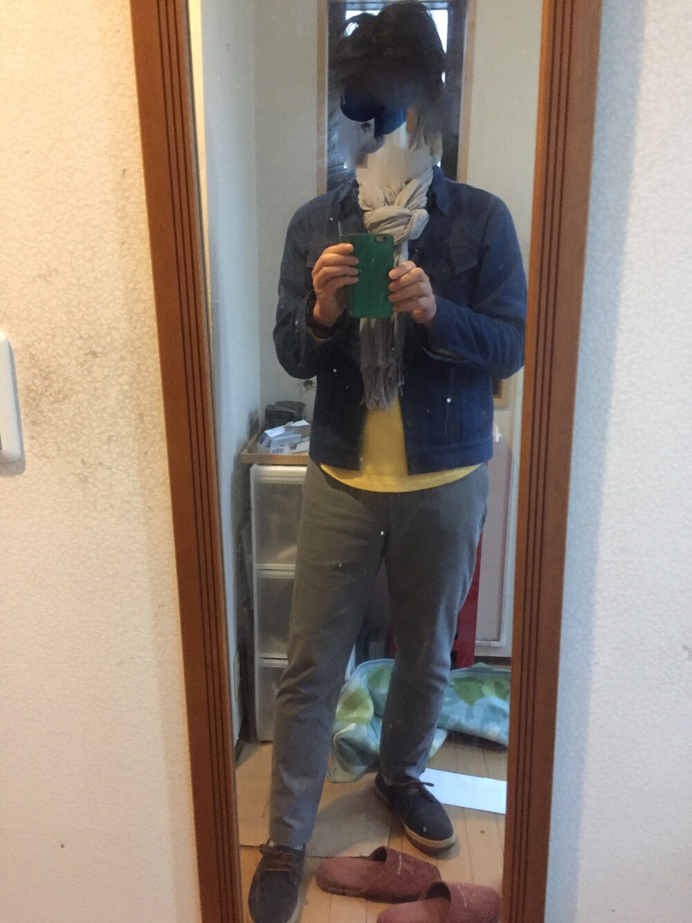 UNIQLOのアンクルパンツがシルエットが綺麗なので、買いました。デニムジャケット、イエロー スウェットとの相性がgood。