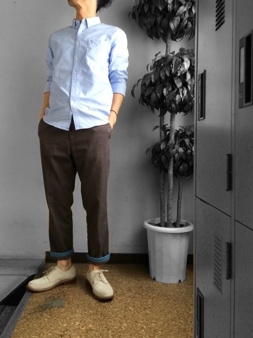 いつも通りなんの変哲もない仕事着なんだけど、白バスがヘタって汚れてもうすぐ逝きそうだから遺影がわりにスナップったの巻 ⍨⃝ あとzozoでバス売ってるやんなんでもあるなぁ。の巻 ⍨⃝