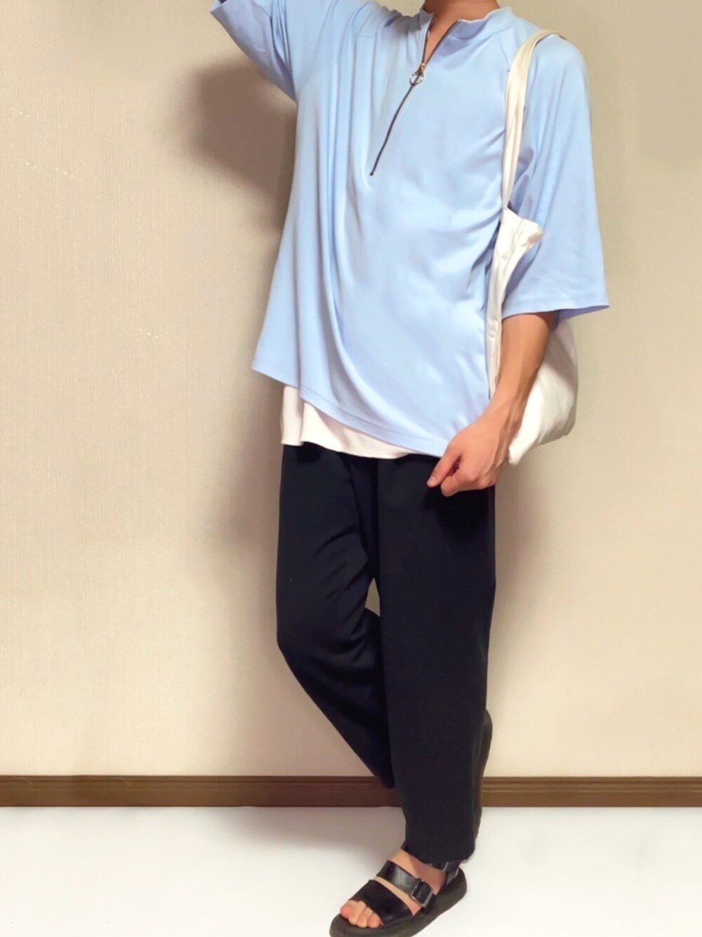 青色コーデのうた⚫️⚪️🔵のTシャツ/カットソー「ファッションインフルエンサー じーの - ハーフジップモックネックTシャツ made in INTER FACTORY」を使ったコーディネート