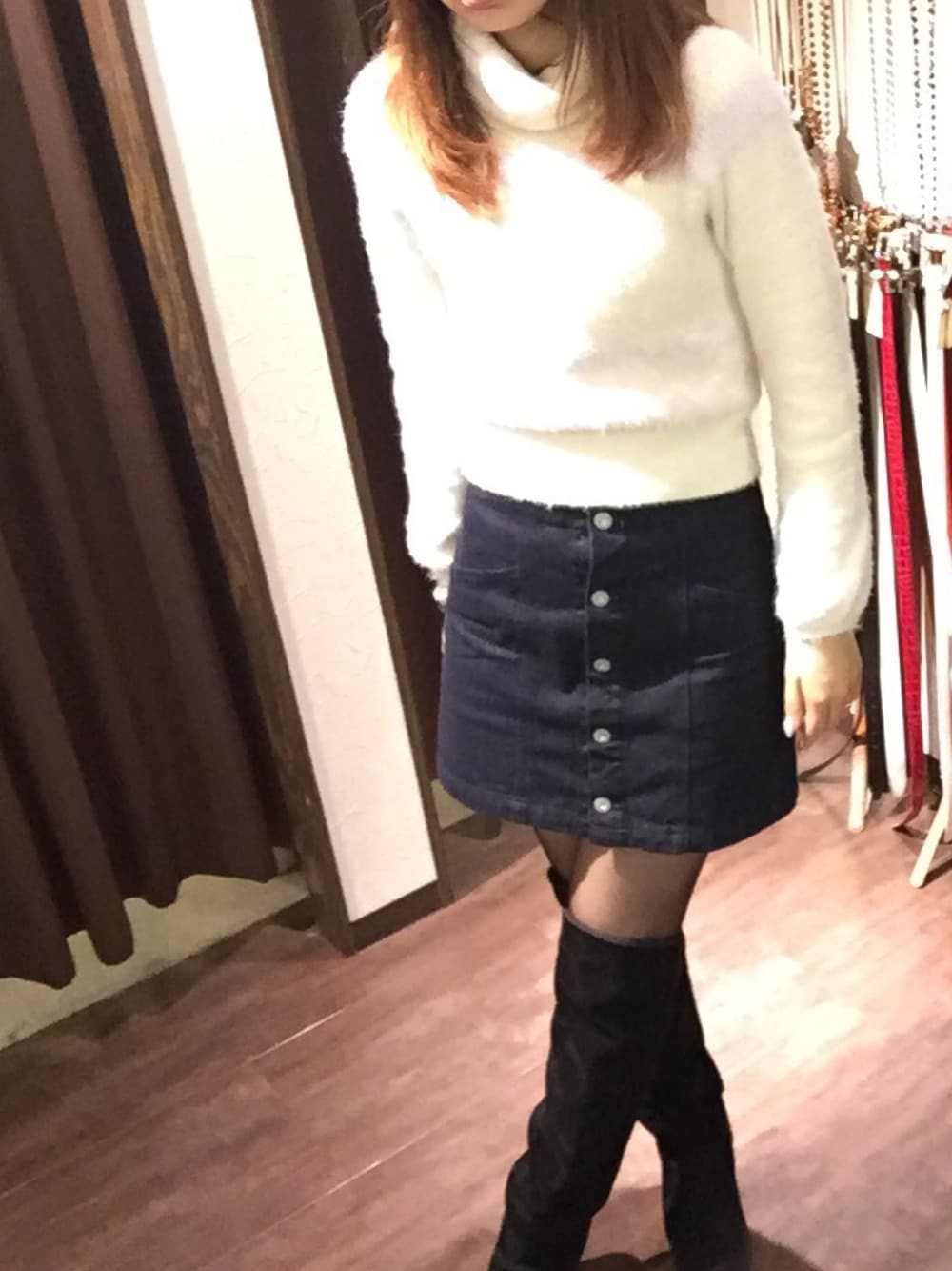 moussyのこのスカートお気に入りすぎてヘビロテ👏 なにより脚が細くスタイル良く見える。 ニーハイブーツ合わせてさらにスタイル良く!