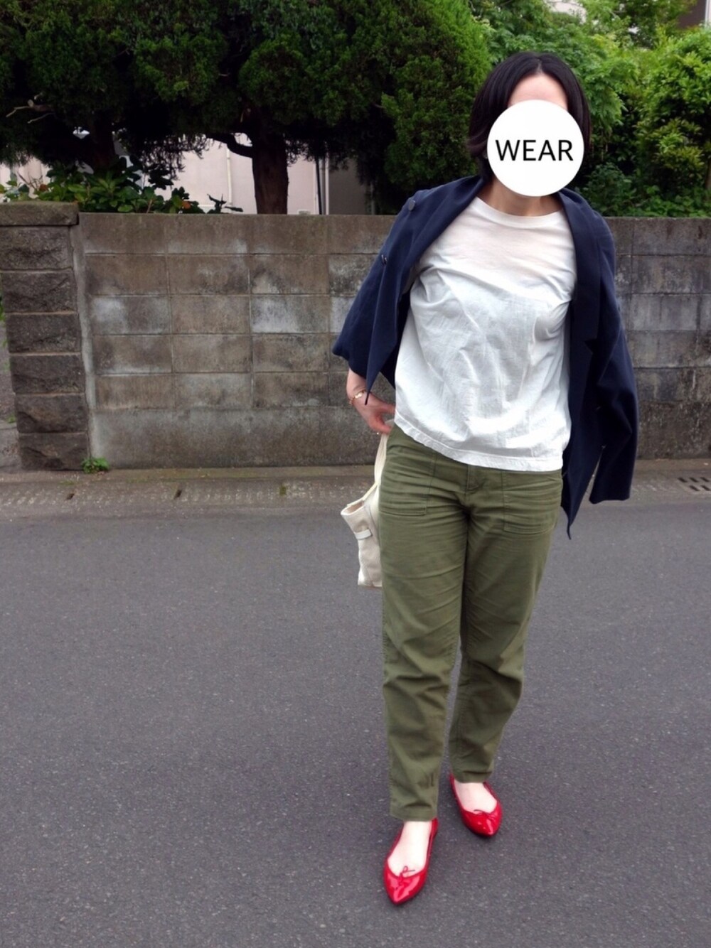 シンプルなジャケットコーデ。 トップスは後ろが可愛いけど、まだ1枚じゃ寒いからジャケット🤭 ポイントの赤レペがやっぱり可愛い🤗 ネイビー、白、カーキに赤。この色の組み合わせ、好き🥰 アクセはレディーに寄せました👯♀️