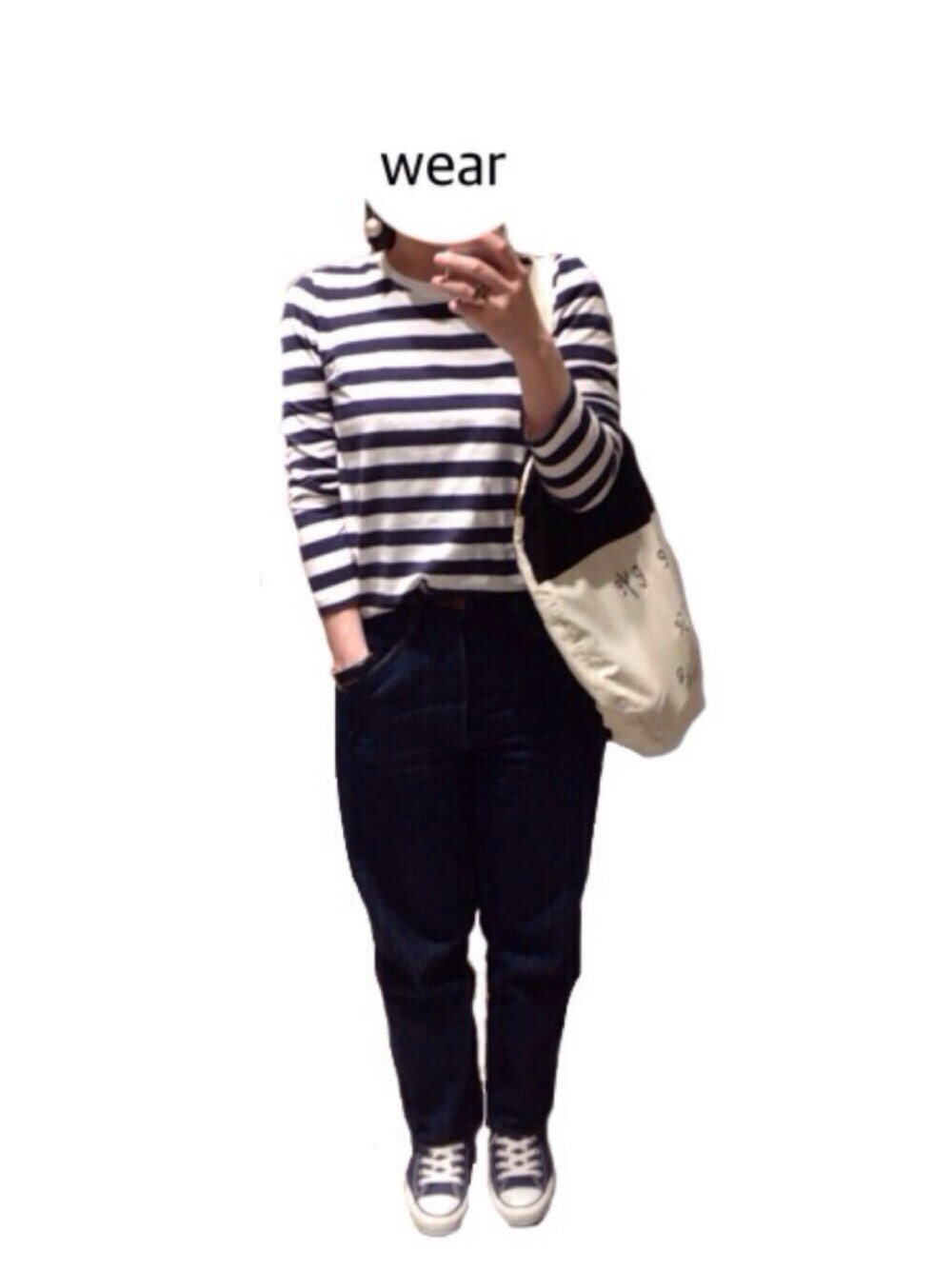 暖かかったお昼間コーデ。 ボーダーはネイビー。 このボーダーは似合わない気がしてたけどトライ!やっと着れた!嬉しい! ボーダー×デニム×コンバースのカジュアル定番コーデ。 ポニーテールまでしちゃってカジュアルすぎたのでピアスはコットンパールに。 気付けばネイビーコーデがだいぶ好きな気がする… 50コーデ目だった🙌✨