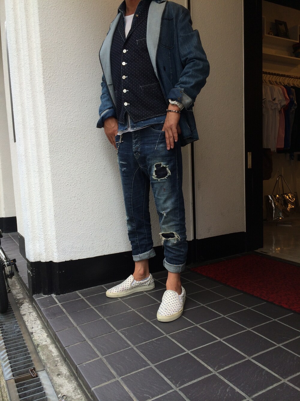 みなさんこんにちはー!今回はH氏お得意のデニムonデニムコーデでキメてみちゃいました😃 中にはドット柄のジレを効かせてドレスよりのクラシックスタイルにしてみました。 christian pellizzari ¥76000 absolut joy ¥34000 royal hem ¥33000