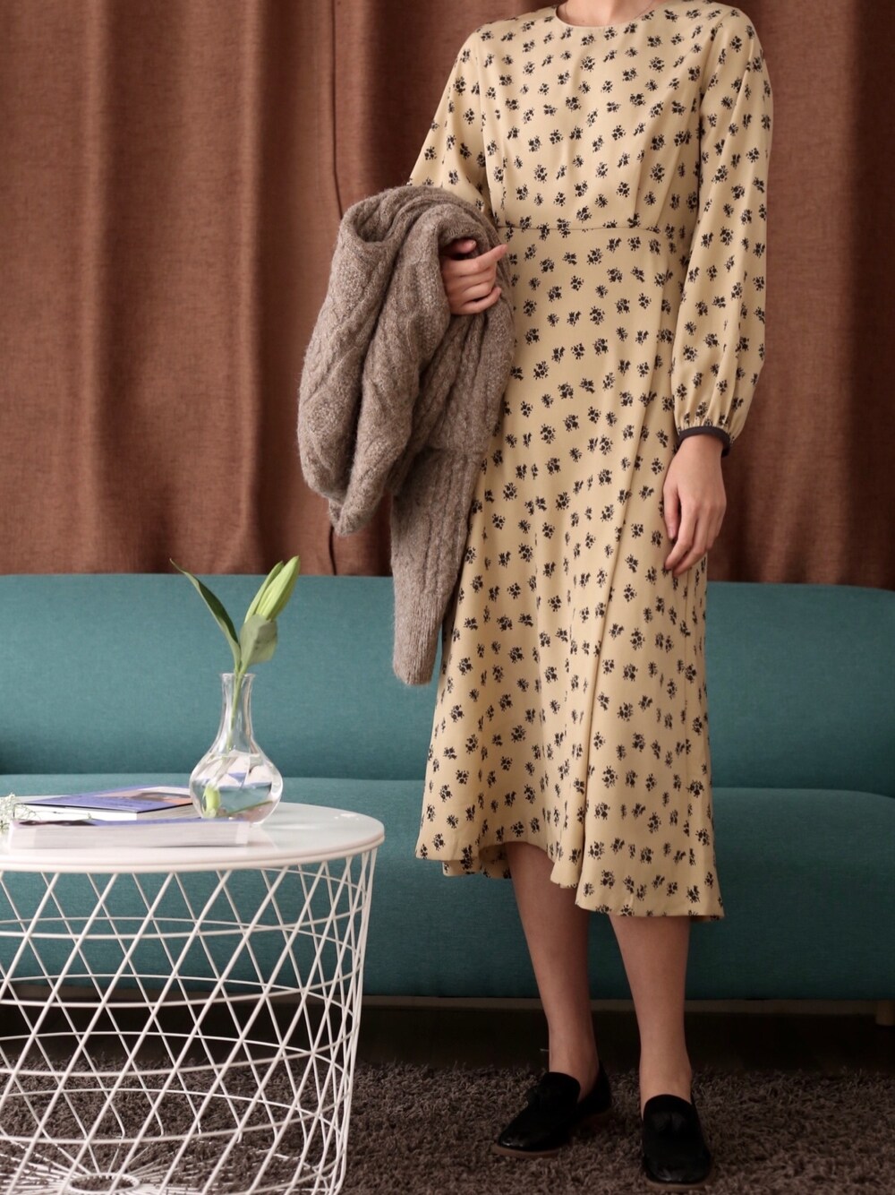 ベージュ系のワンピースを着用したレディースの秋コーディネートの1枚目の写真