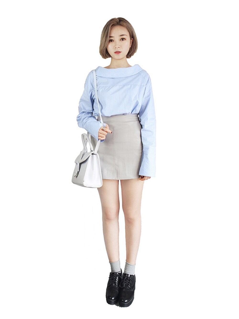 ブルー系のシャツ/ブラウスを着用したレディースの春コーディネートの1枚目の写真