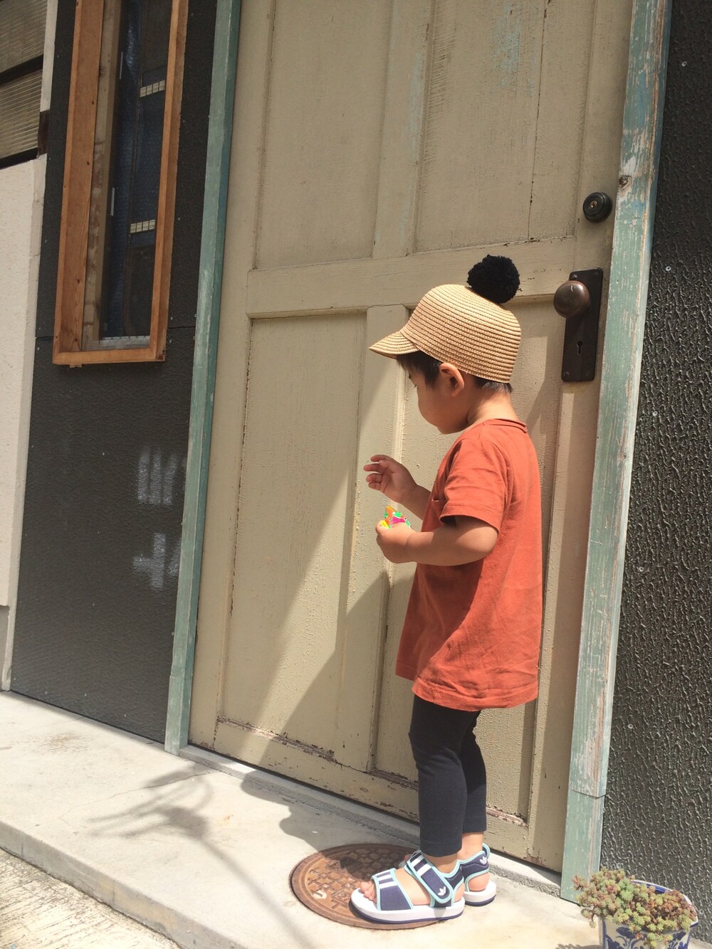 ブルー系のサンダル、ベージュ系のキャスケットを着用したキッズの夏コーディネートの1枚目の写真