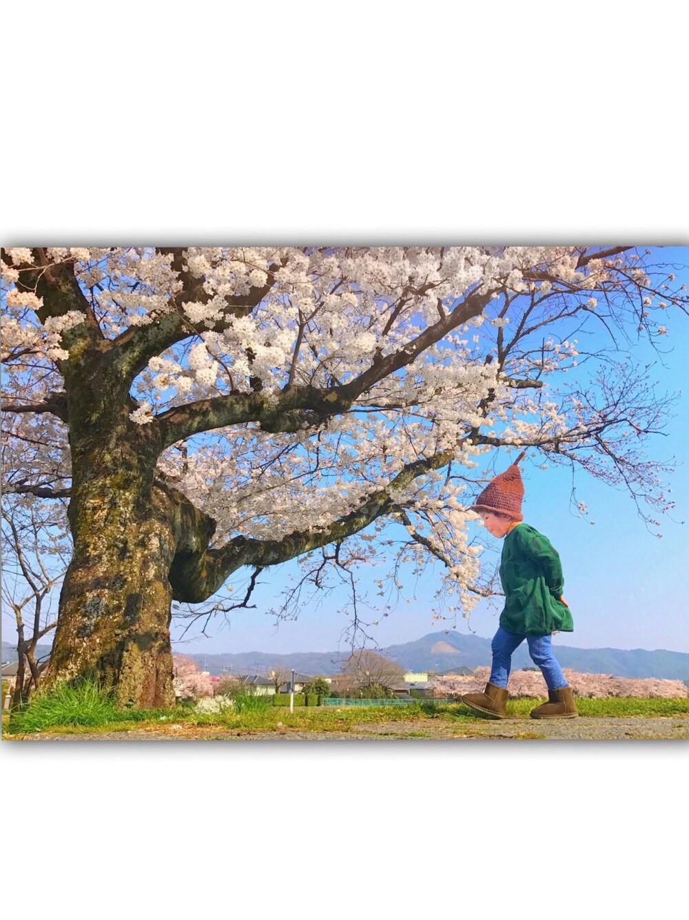 前々回のコーデの色違い♡ 京都は桜満開🌸 桜と大文字山をバックに賀茂川でパシャリ📸 贅沢なショット♬