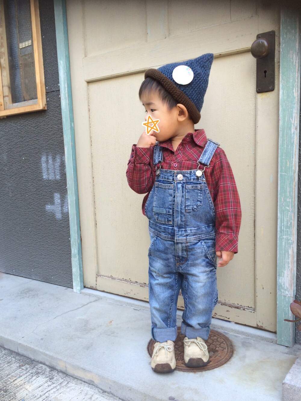 レッド系のシャツ/ブラウス、ブルー系のサロペット/オーバーオール、ブルー系のニットキャップ/ビーニーを着用したキッズの秋コーディネートの1枚目の写真
