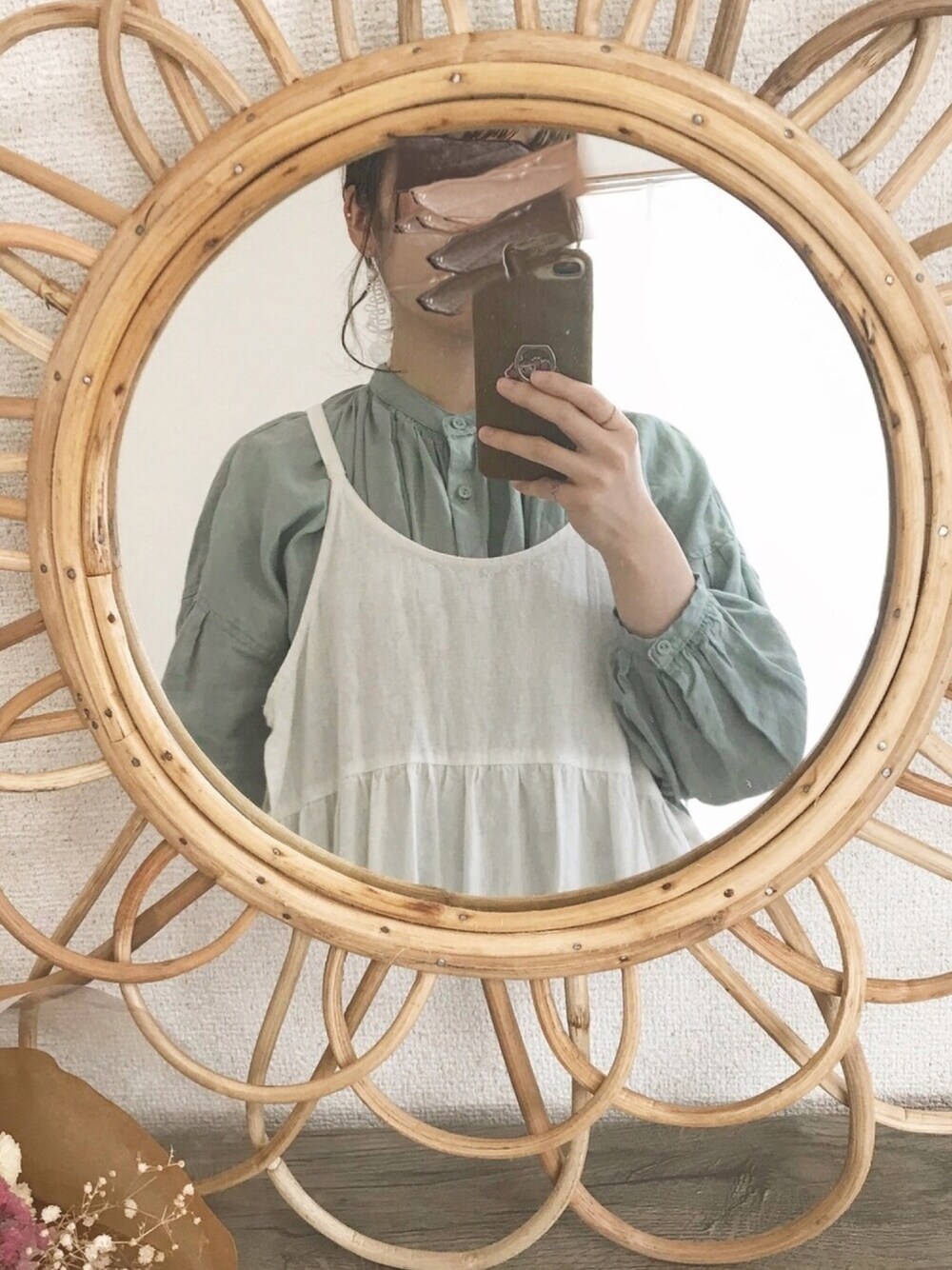 ピスタチオカラーブラウスの着回し🪐 キャミワンピは見えないですがエプロン風で サイドがガバッとあいてリボンがついててめっちゃかわいい…