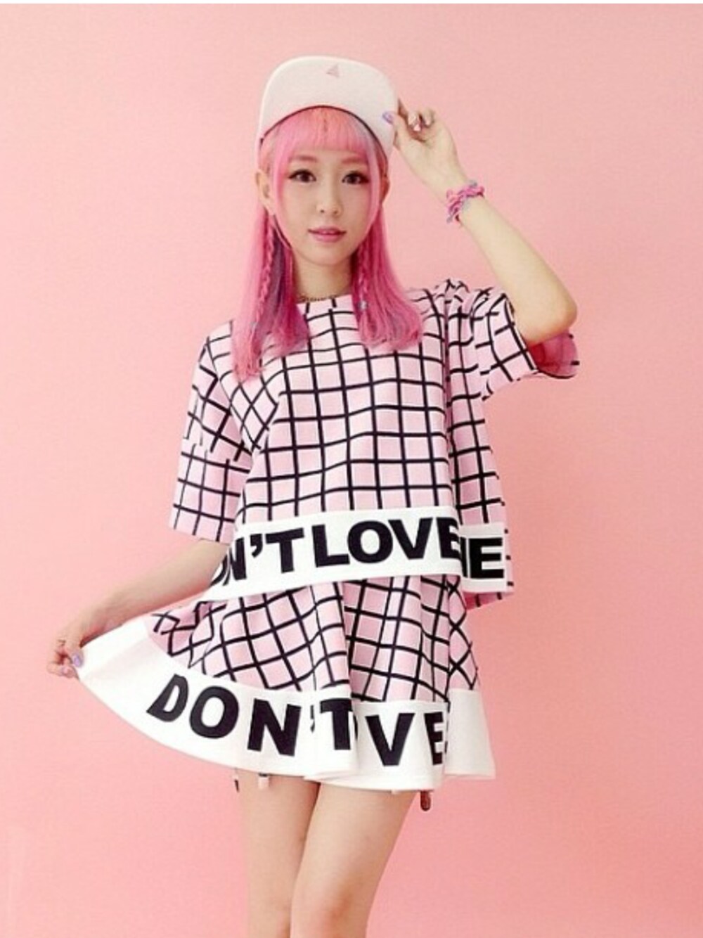 ピンク系のチュニックを着用したレディースの夏コーディネートの1枚目の写真