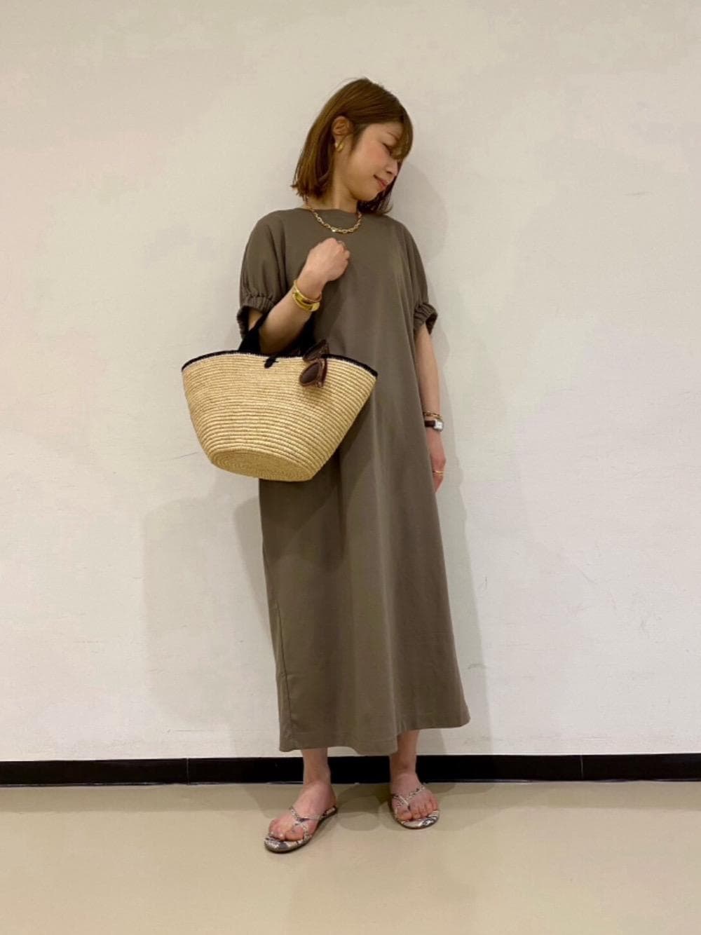 【身長】 155cm 【普段サイズ】 トップス36/ボトムス34・36/シューズ36(23cm) 【サイズ感】 トップス:標準 スカート:標準 【素材感・着心地】 ワンピース:シワが目立ちにくいジャージー素材、締め付けがなく体のラインを拾わないので安心して着れます。 【コーディネイトのポイント】 ゆったりしたシルエットのワンピースは、サングラスやカゴバックをプラスして、レジャーやリゾートスタイルに活躍します。