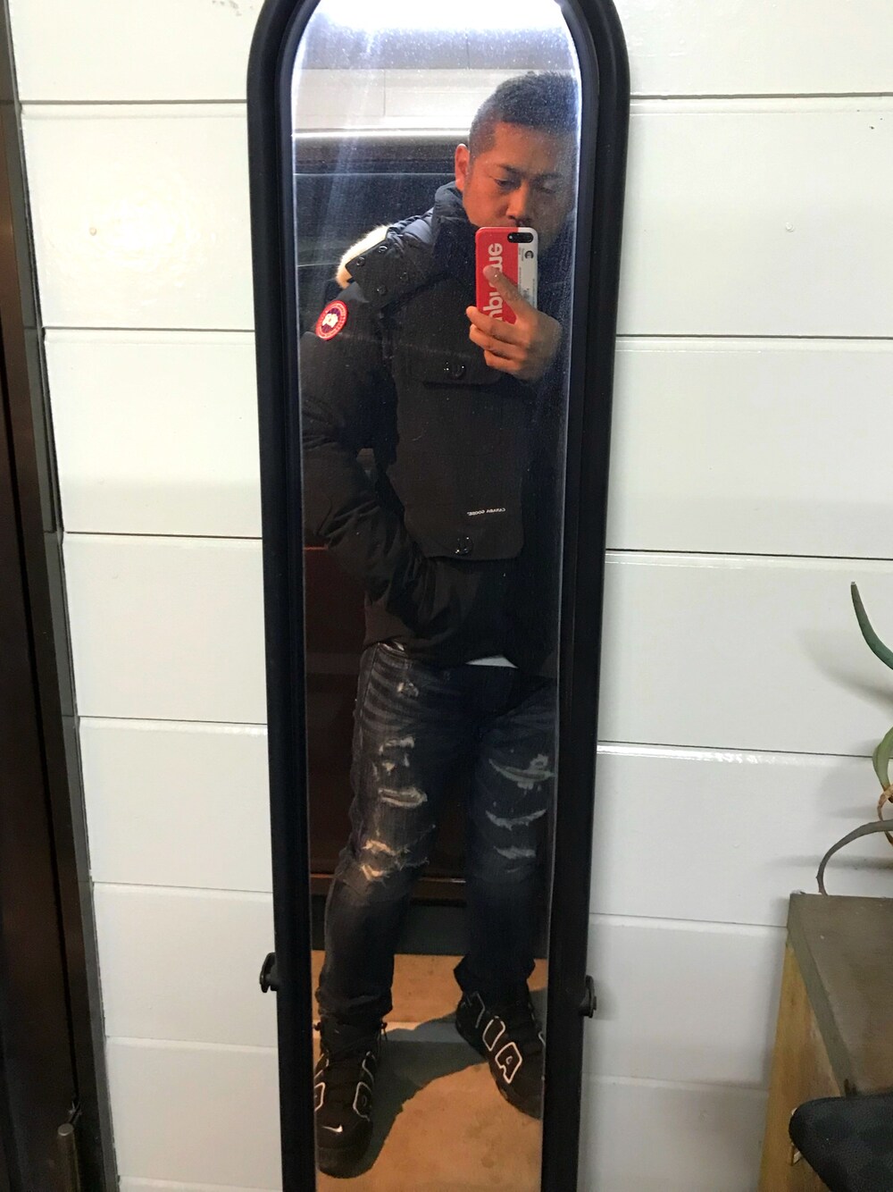 アウター「カナダグース・ラッセル」インナー「チャンピオンのロンT」、デニムはアメリカイーグル、スニーカーはNIKEモアテンブラック。