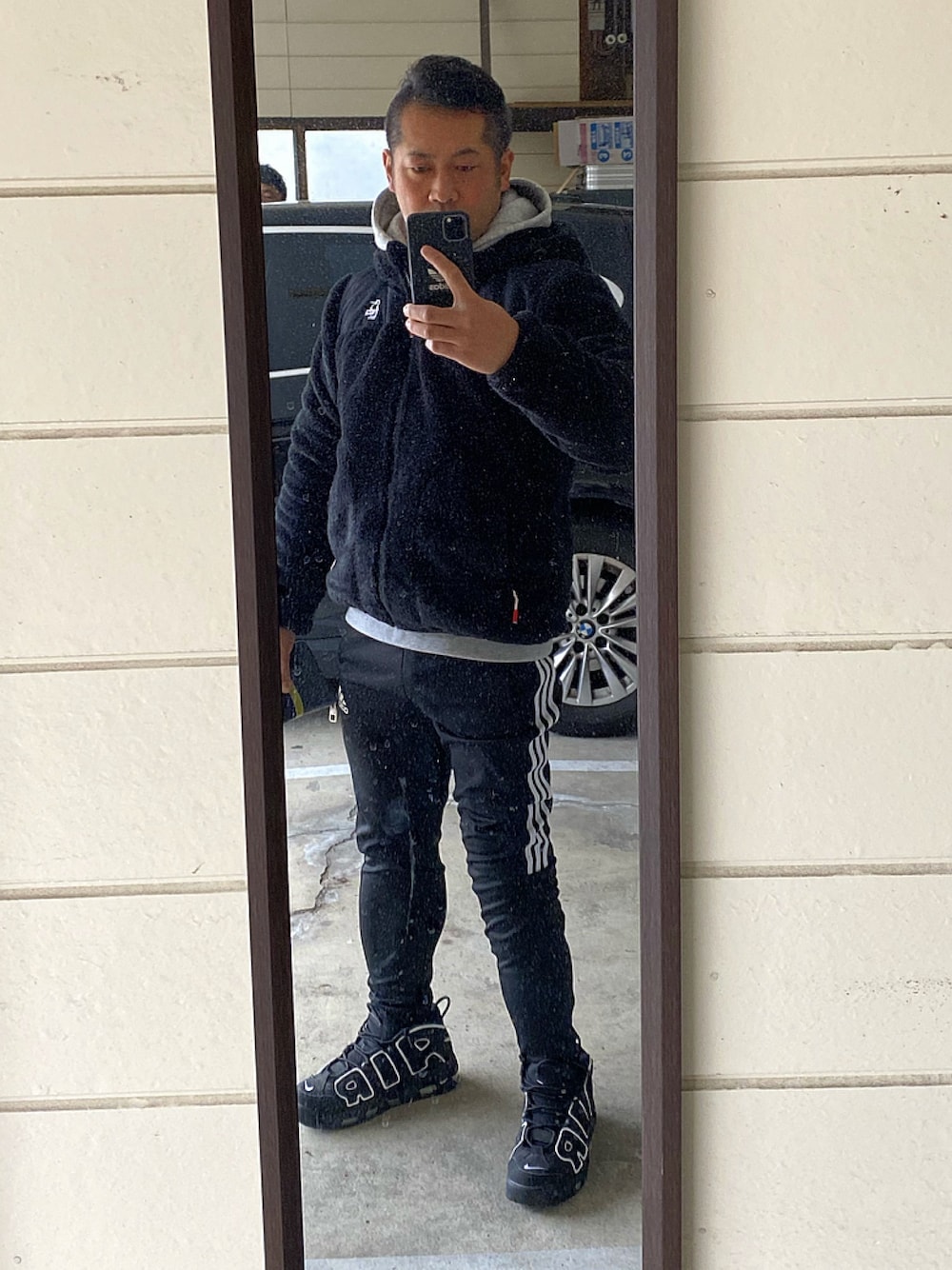 チャムスのモコモコフリース、H&Mのパーカー、アディダスのスキニーパンツ、ナイキの黒のモアテンコーデ。