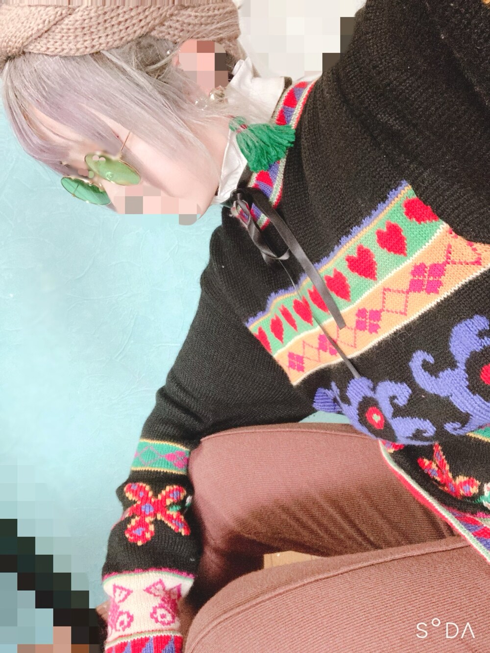 派手柄ニットに付け襟を合わせて、顔まわりを華やかにしたよん❁ 上下ニットで防寒もばっちり! 髪はまとめてスッキリ◎