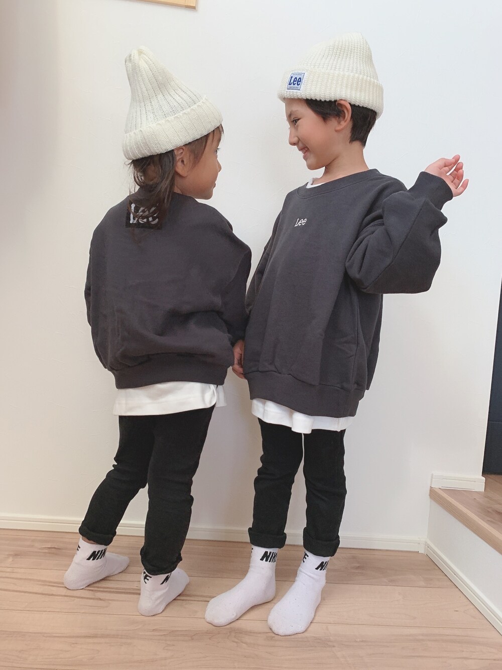 チャコールグレーが可愛すぎる🥺 100.120.140しかサイズ展開がなくて 下の子は100センチに! 110があればよかったのになぁ😓