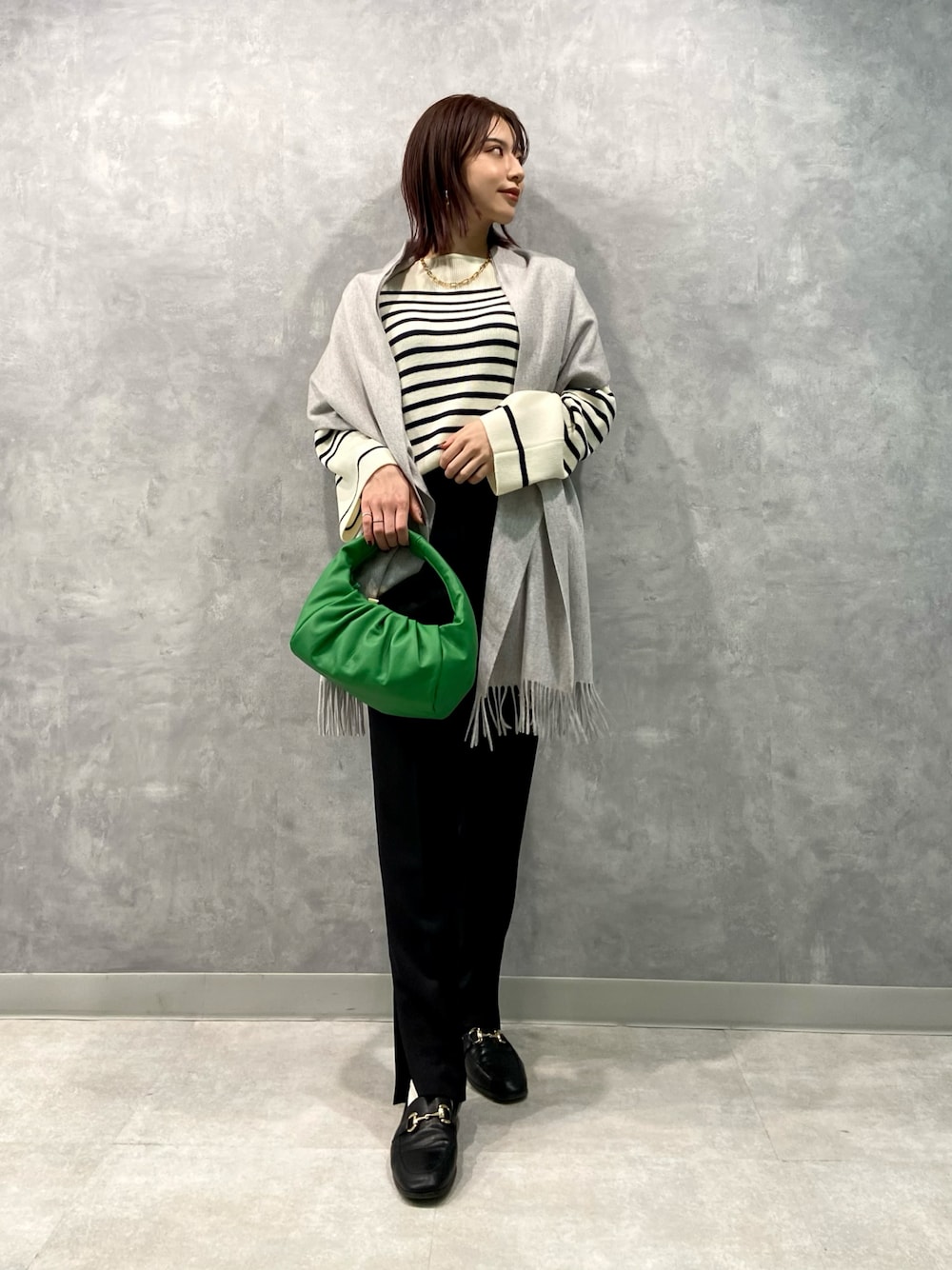 グリーンバックがアクセントに♡ ニュアンスボーダーとカシミアストールが 大人っぽいカジュアルスタイル!
