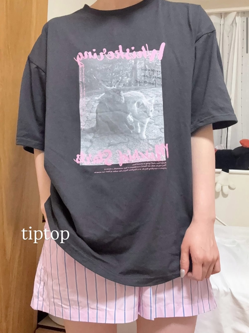 あんまり一日中家にいることってないけど、最近暑くてバテちゃって💦 1日家にいる時くらい可愛くて楽ちんなものを着たい! UNIQLOのセットアップを手に入れてたんだけど、トップスは長袖なの。 今はもう暑くて着れないからトップスを tiptopの【アソートフォトロゴBIGTシャツ】と合わせてみたら、ベストマッチ🩷 これに黒ジャケット羽織って、白ソックスにローファーなんて履いたら海外ガールコーデみたいで可愛い! 今度やってみようかな🧐 ユニクロのパジャマバズってて持ってる人も多いと思うので是非この合わせ方真似してみてね!