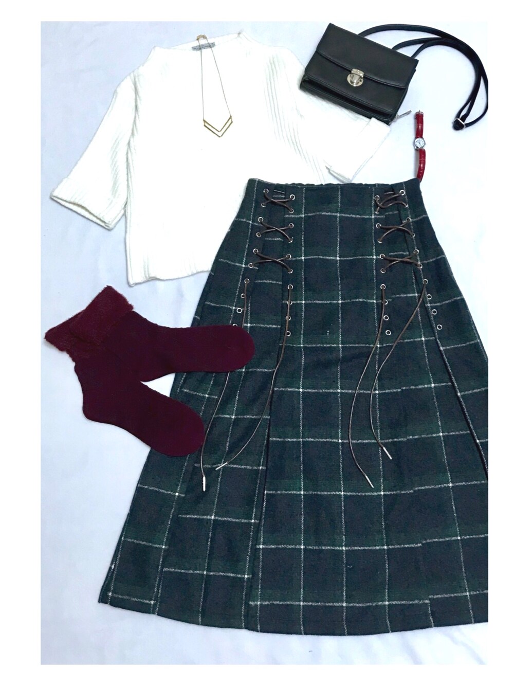 しまのスカート「サイドスピンドル起毛チェックスカート」を使ったコーディネート