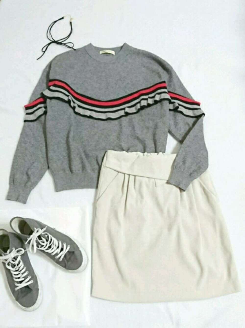 LINE@で配信されて気になってた。フリルプルオーバー🎶🎶 カジュアルにも、プリーツスカートにあわせてフェミニンにも行けそう!😆😁😘😬💗 着回しが楽しみ😊😌😊 GUのハイカットスニーカーはよく人にそれGUなの?って言われます。お気に入り!