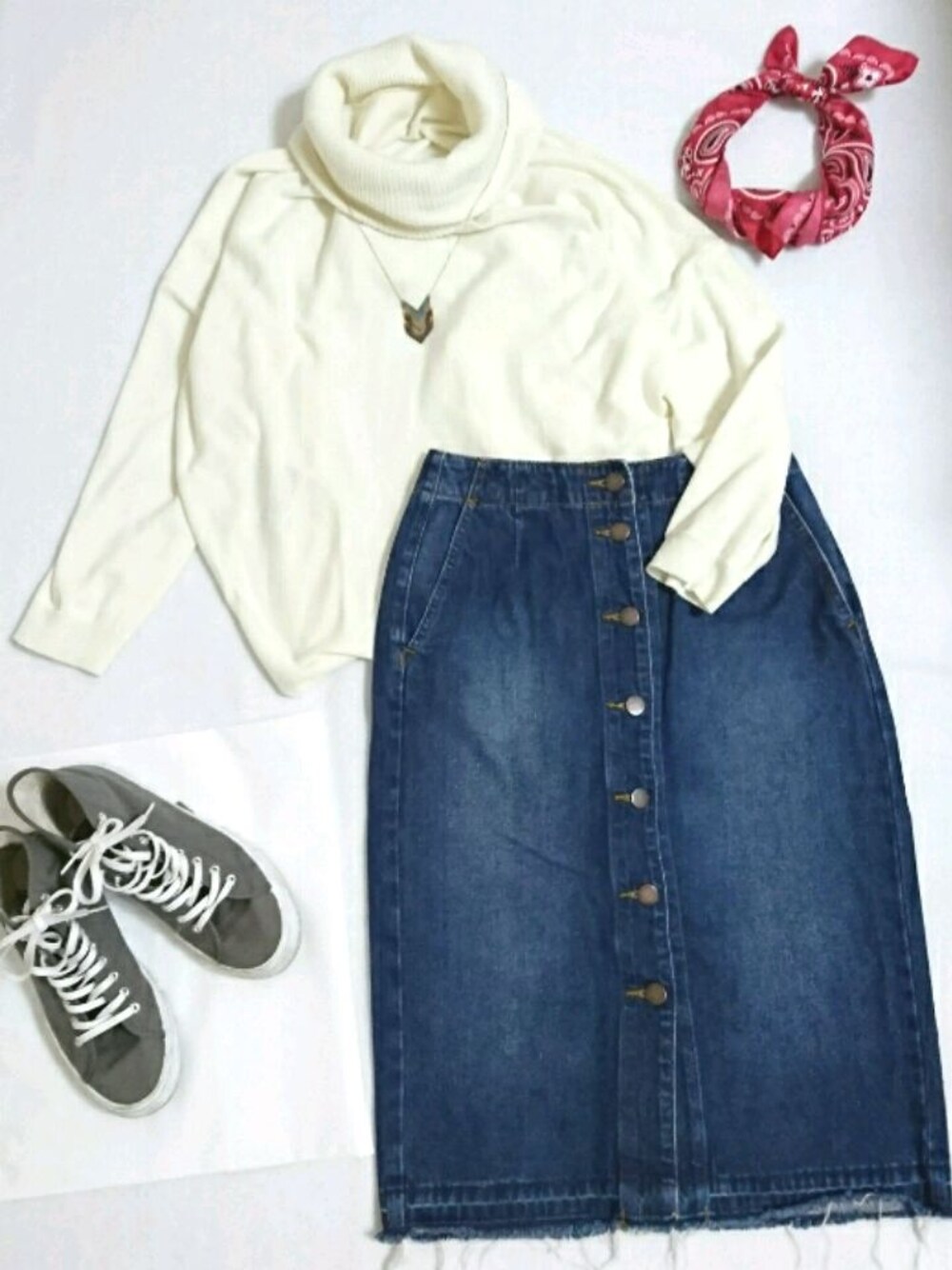 ほぼGUコーデ。💫👀💫 裾フリンジデニムスカート 1480円 バンダナ 590円(だった気がする) スニーカー 1990円
