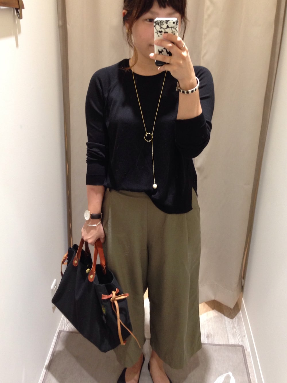 ザ・シンプル♡ 夏のSALEで買った、カーキのワイド使える〜^ ^ ハンドメイドのネックレスが目立つように、ザラの黒ニットに合わせました〜♪♪