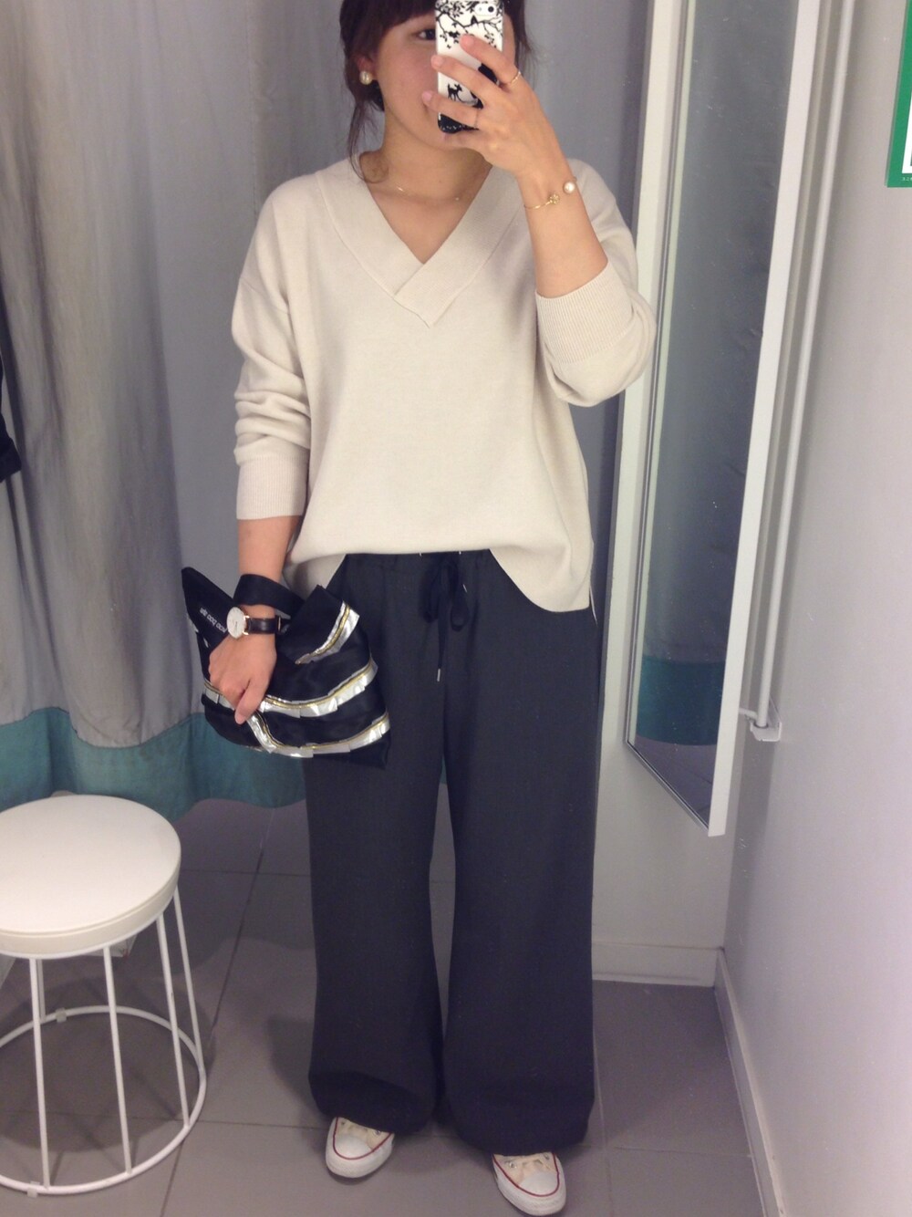 今日は、たまにある平日休み♪♪ お友達とショッピングへ〜♡ なので、リラックスコーデ^ ^ 最高のゆるゆるぐあい…♡ アクセは、パールイヤリング パールブレス・eteの一粒ダイヤネックレス✨