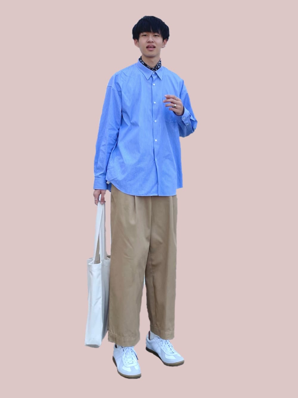 見ていただいてありがとうございます😊 あまりしないブルーとブラウンベージュの組み合わせ😌 やっぱりパンツは太いのがいい🥰 ハリのあるコットンチノなので、着てても太いシルエットを保ったまま😉 顔は... ... もう諦めてます😇 【ポイント】_______________________ ①首元にスカーフを巻いて、さりげないワンポイントに。 ②身幅の広いシャツとパンツを用いて、シルエットで差別化を。 ③シャツとパンツで濃い色を使っている分、バッグや足元に白を入れることで爽やかさを演出。 _________________________________
