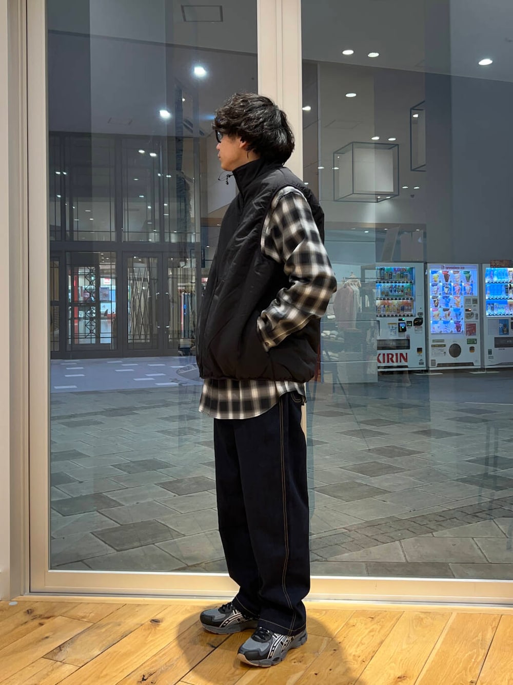 いつもご覧いただきありがとうございます! ワントーンでもベストのインナーはオンブレチェックで少しお洒落な印象を。 大人なスタイリングです。