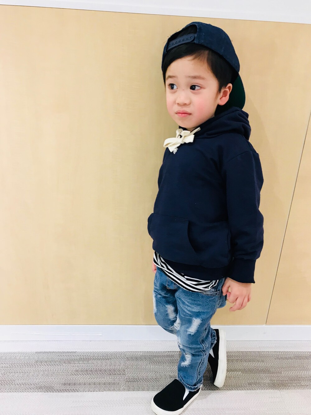 西松屋の1000円のキャップ 韓国服の無地のパーカー1580円 ダメージジーンズ1280円 ヒラキのスニーカー180円 子供の服は安くて親の趣味で。