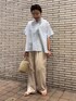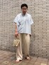FORK&SPOONのシャツは、 生地がとっても柔らかくサラッとしているので、汗をかきやすい今の季節にぴったりの薄手シャツアイテムです! 形も体型を拾わず、風もふわっと通るので快適かつおしゃれに体型カバーも叶うアイテムです! 今回はリネンのパンツと合わせて涼しげに!!カチッとしたスラックス等を合わせても素敵に仕上がります!