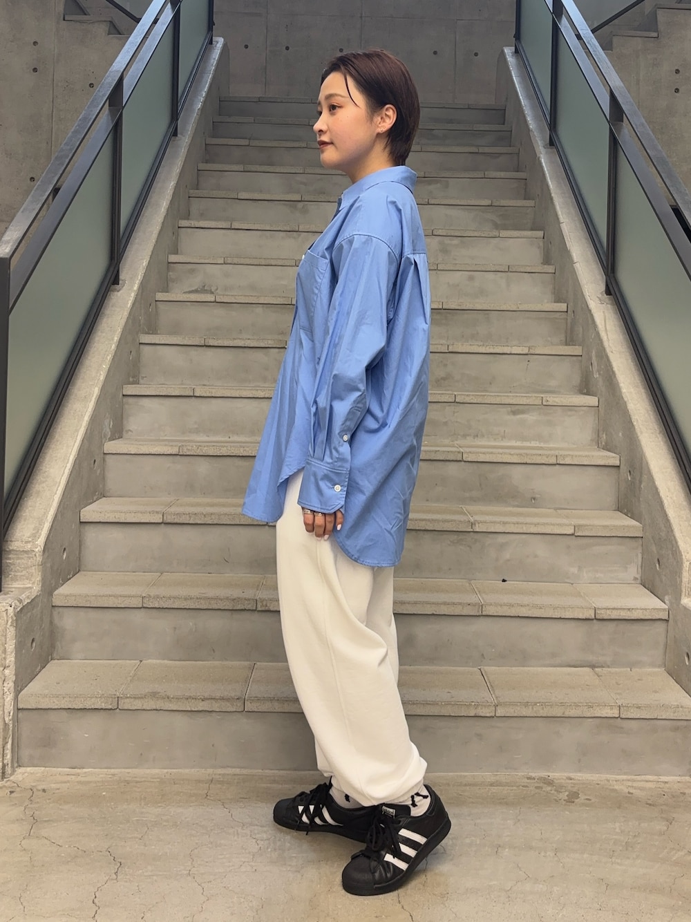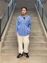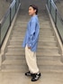 明るい水色のシャツなコーディネート全体が明るく見え、一気に春らしくなります!! シャツは襟元を抜いて少し女性らしく。 カジュアルが好きなので足元はスニーカーで合わせました。