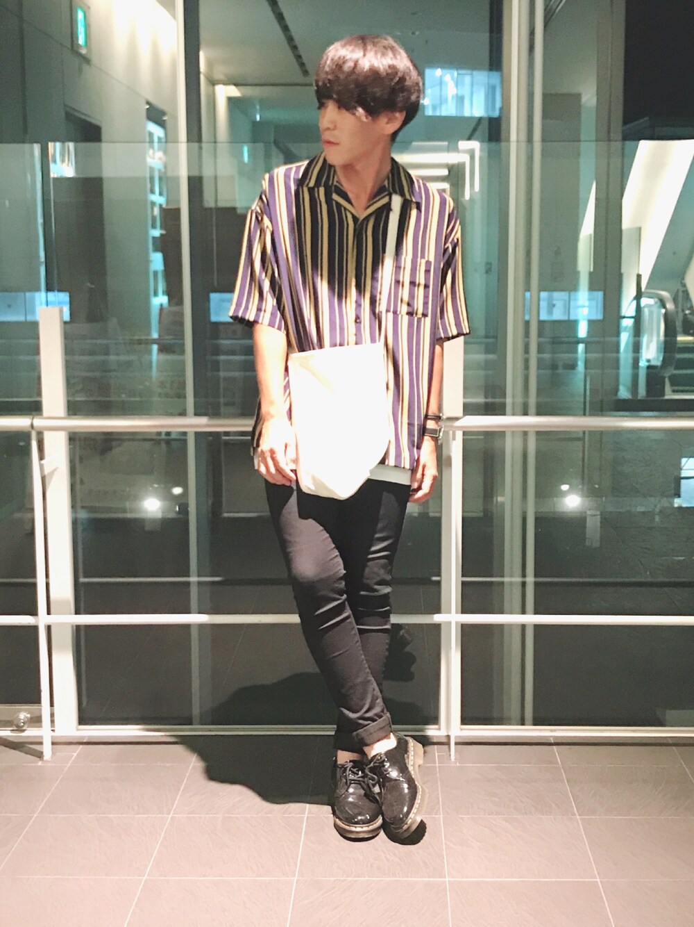 どうも、まきおっす‼︎ いつもいいねやフォローありがとうございます‼︎ ストライプオープンカラーシャツ×スキニーコーデです‼︎ よろしくおねがいしやーす‼︎
