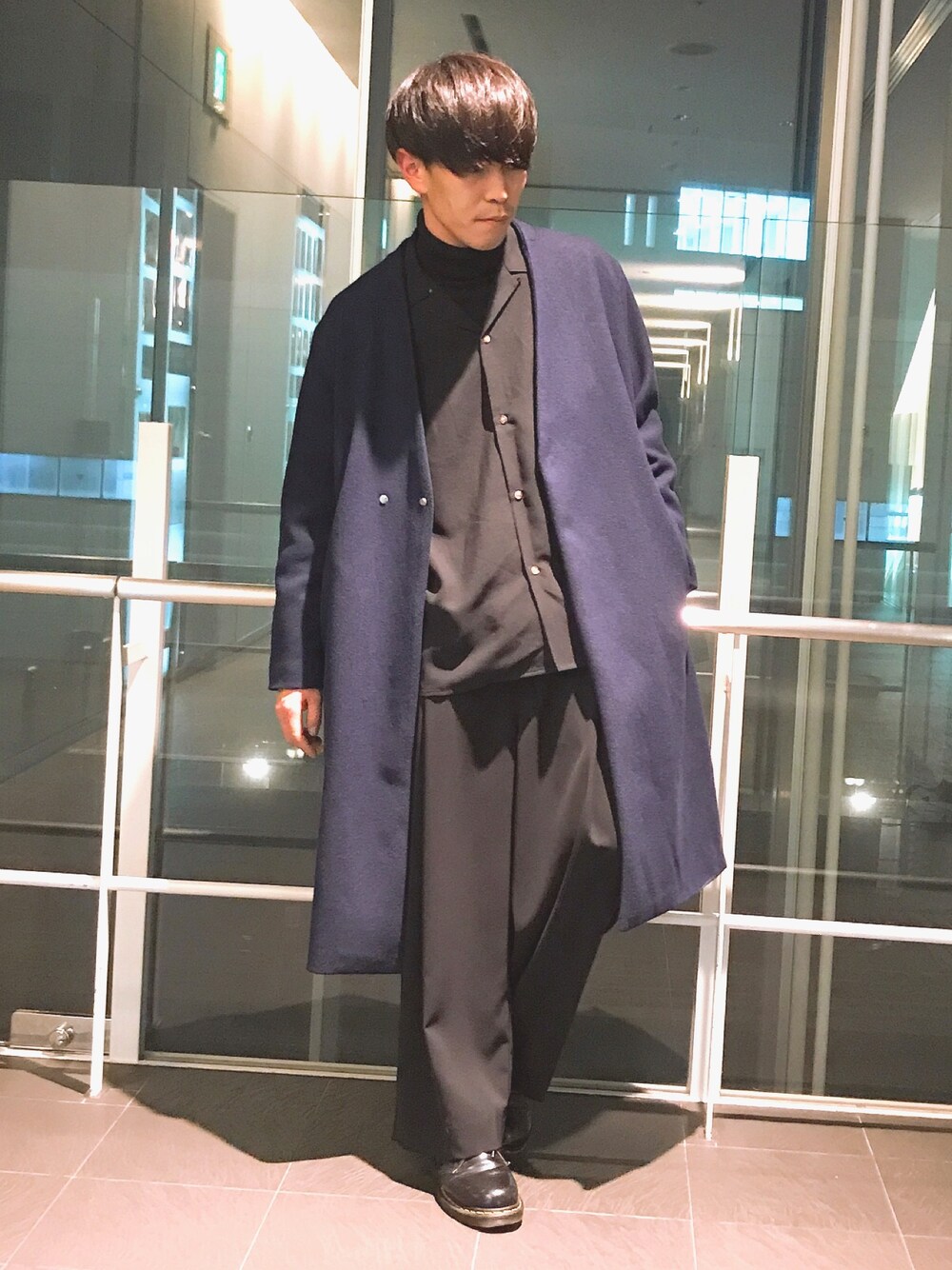 まきおのノーカラーコート「オーバーサイズビーバーメルトンVネックロングコート」を使ったコーディネート
