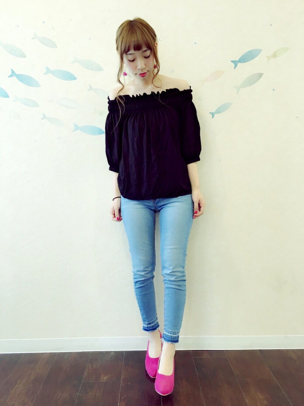 秦さんのRainって曲、、、、、 なんてキレイで素敵な曲なの‼︎ 雨の日に車の中で1人でこの曲聞いて ジーンとするのが最近のマイブームです。 コーデ⭐️ 夏の終わりのオフショルダー。〜ピンクを添えて〜 って感じかな!タイトル付けるとすると。 このオフショル、シャーリングがキレイで 五分丈くらいだから秋でもいける! 薄めのスキニーとピンク色散りばめて女の子コーデ💟