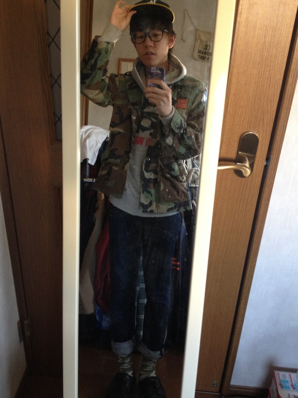 今日は迷彩! 迷彩ジャケット 古着 渋谷のaNiKi 迷彩パーカー ユニクロ 迷彩柄の靴下 ラルフローレン デニム ユニクロ レザーシューズ Casper John キャップ 古着 HAIGHT&ASHBURY 黒縁メガネ レイバン ところどころに迷彩柄をいれてアクセントに。 迷彩柄のプルオーバーのパーカーはユニクロで売っているのでおすすめですよ(^O^)笑