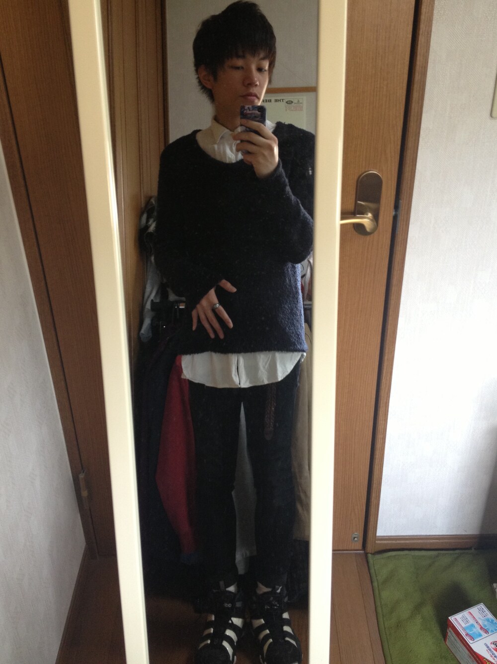トップスとボトムスがタイトなので足元にボリュームを出しました。 セーター HARE シャツ 古着 HAIGHT&ASHBURY スキニー 白靴下 ユニクロ ロングベルト HAIGHT&ASHBURY リング HAIGHT&ASHBURY adidasスニーカー もらいもの 全体的に暗めなので白をところどころに入れて軽さを出しました。 スニーカーの配色も気に入ってます。