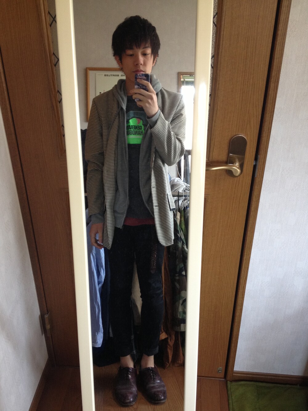この間買ったUNDERCOVERのTシャツ。 緑とワインレッドを差し色にし、他は黒やグレーなどで落ち着かせました。 ジャケットのインナーやパーカーでラフさを出し、レザーシューズで引き締めました。 ジャケット 古着 大宮のGIFT パーカー、スキニー UNIQLO Tシャツ UNDERCOVER 渋谷のラグタグ タンクトップ 古着 サンタモニカ ロングベルト 古着 HAIGHT&ASHBURY レザーシューズ 古着 HAIGHT&ASHBURY