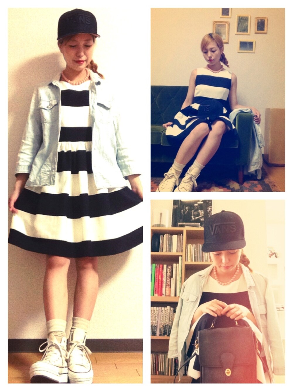 CAP/VANS BAG/COACH 靴下/FRAPBOIS ネックレス/vintage 部屋撮りという謎タグなので、 いろんな壁で撮ってみました。 だから何? っていう、、、笑 ボーダーワンピにデニムシャツ、 capとスニーカーで崩して パールネックレスで締める。 まさに王道ですね。